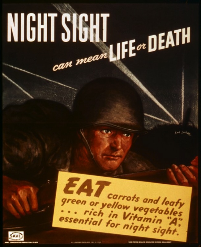 Den Briten lag viel daran, diesen entscheidenden Vorteil im Krieg nicht publik werden zu lassen. Das Problem war allerdings, dass der Luftwaffe schnell auffiel, dass sie mehr Abschüsse und Verluste zu verzeichnen hatte – die britischen Erfolge bedurften einer Erklärung, die das Bordradar verheimlichte. Und da kamen die Karotten ins Spiel. Der Zusammenhang von Betacarotin und Retinal war schon bekannt, da erschien die Erklärung der britischen Wissenschaftler nur logisch: Erhöhter Möhrenkonsum erhöht die Nachtsicht, und weil die Piloten der Royal Air Force massenweise Karotten essen, schießen sie mehr deutsche Bomber ab.
